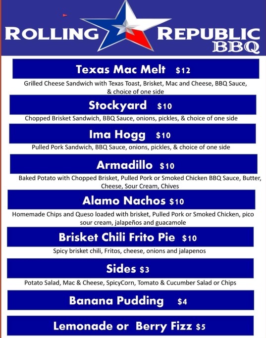 The Homeowner’s Association has arranged for Rolling Republic BBQ to be at the park Thursday from 5-8PM – see their menu below and then come visit – others coming in the next few weeks!